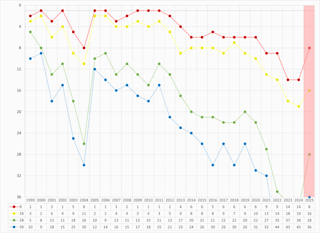 Next I looked at where 2025’s rank 8, 16 (a seeded spot), 28 (no play-in) and 36 (regionals) would rank each year since 1999.