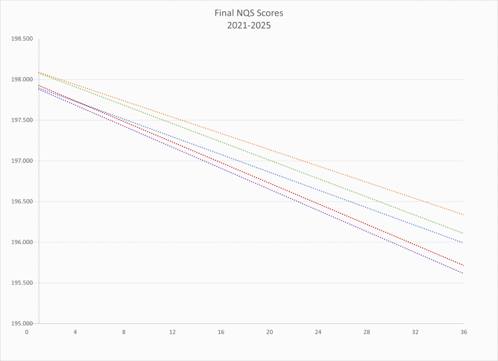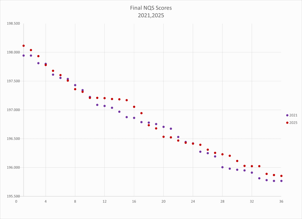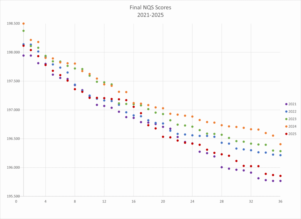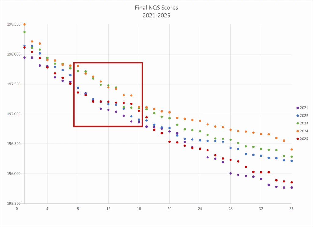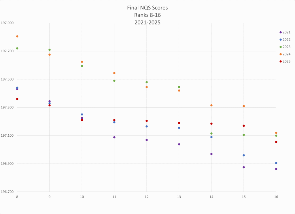 The area that interests me most is ranks 8 through 16. The top team tends have unexpected NQS scores (2023 and 2024 were very high, 2021 and 2022 were very close to second), but the remainder of the top 8 and bottom 16 look like you’d expect with generally straight lines down. 2021 and 2025, as expected, have lower bottom end scores than in the other three years because that’s where most of the difference in NQS scores can be seen. Ranks 8 through 16, however, have a less linear pattern.