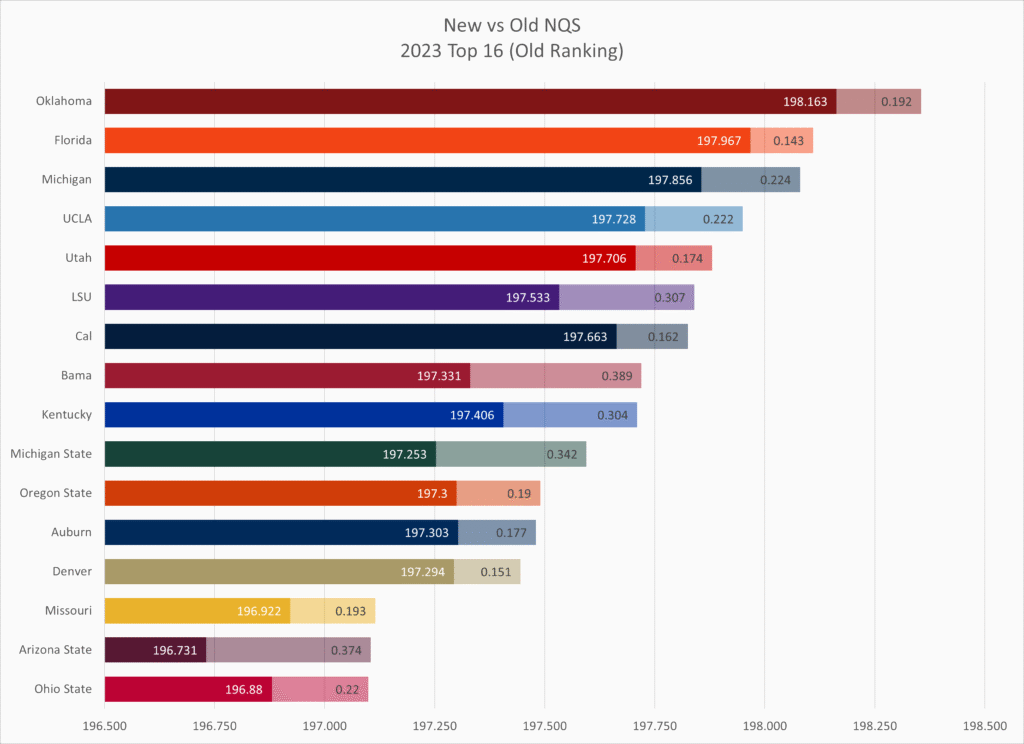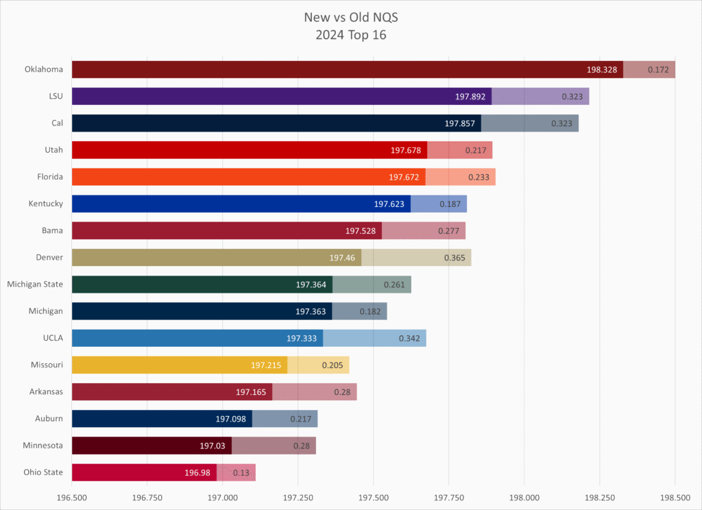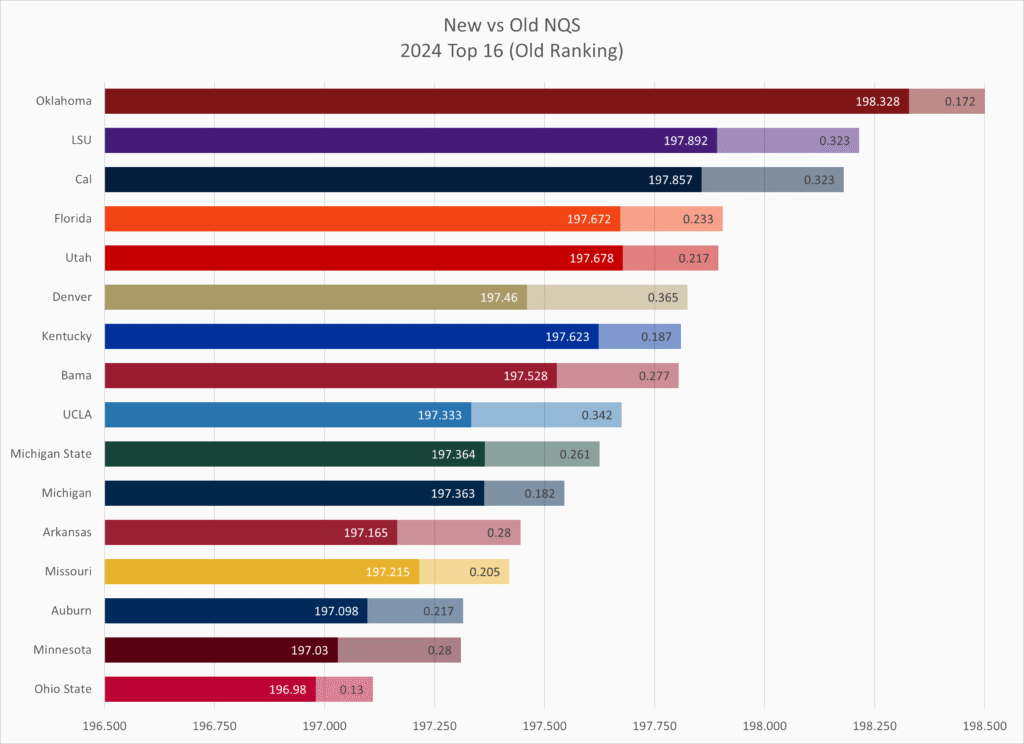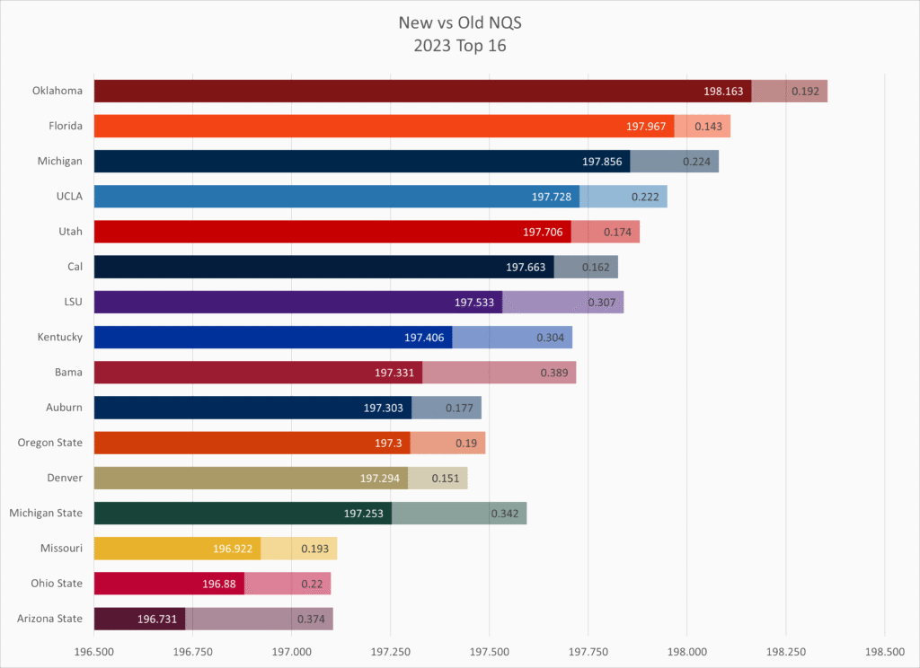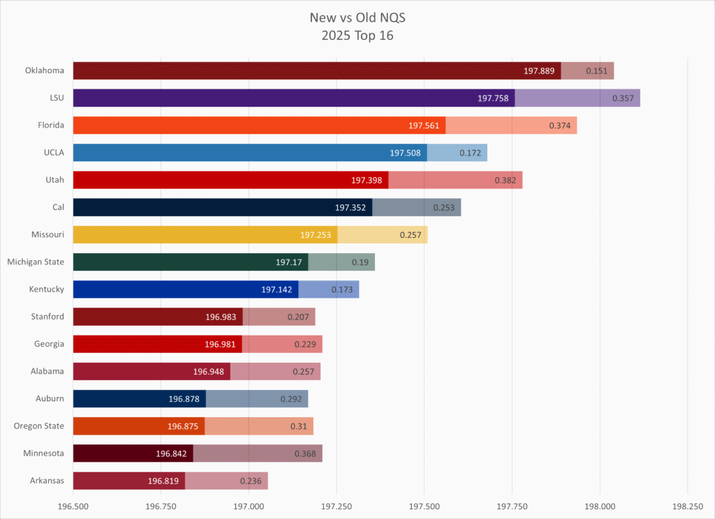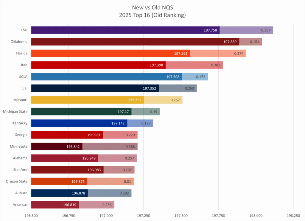 Kent State and Towson both fell by 10 slots, with Kent State showing the downside of having to count one or two very low outliers (they had two meets in the low 194s while the rest were 195s to low 197s), and Towson showing the downside of having a lot of meets (14 meets total) with a wide range of scores that didn’t count under the old NQS system but are now taken into account.