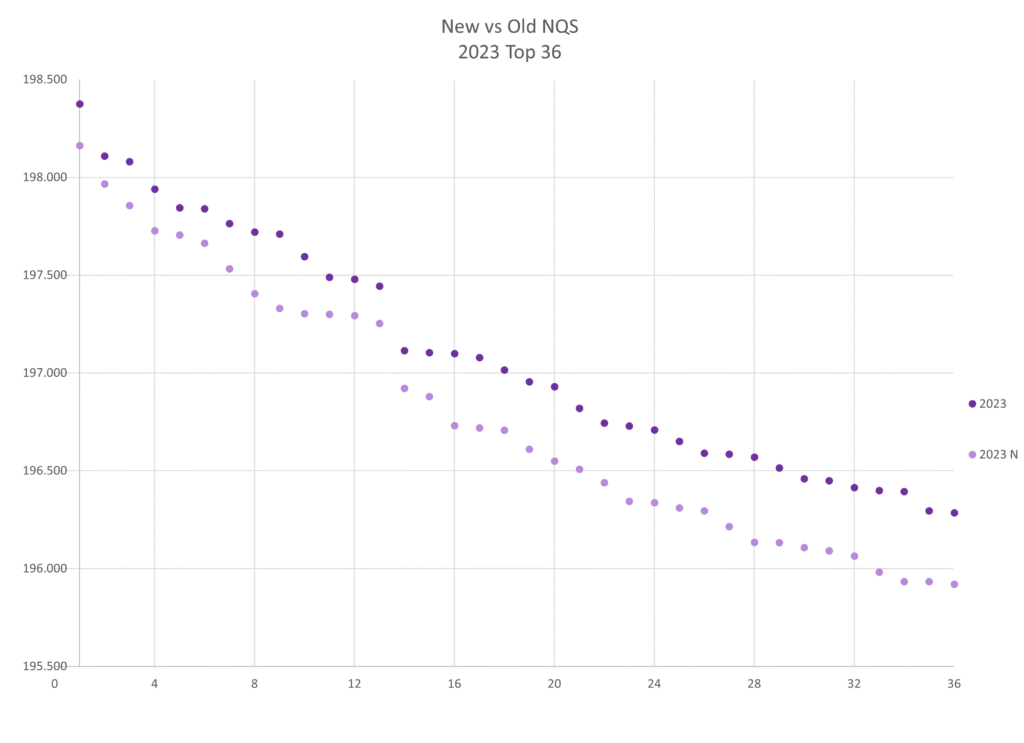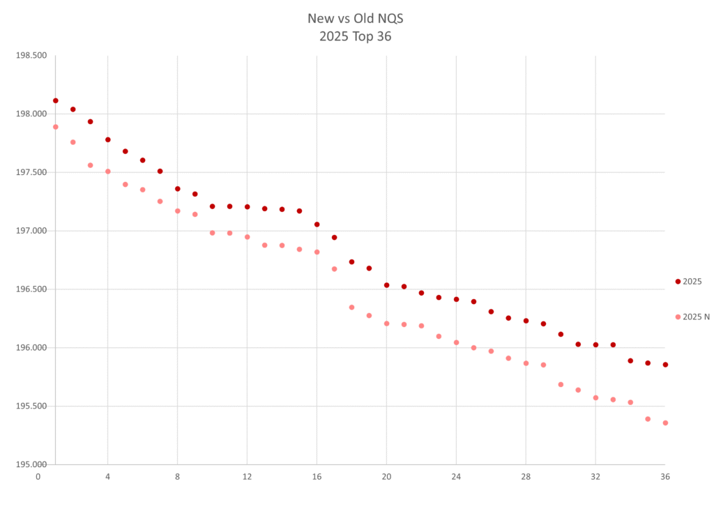 So how do the new vs old calculations change NQS scores and rankings? I looked at 2023 through 2025 (because those are the three years my NQS spreadsheet hadn’t changed too much to just copy-paste the numbers over and I am too lazy to manually add new numbers). I have sorted the top 16 by both the new and the old NQS rankings so you can compare based on whichever metric you’d like, and I have included a chart with the top 36 teams that would have made regionals based on the new metrics.