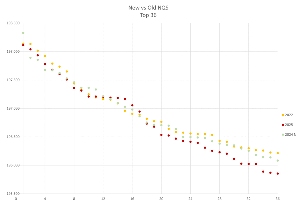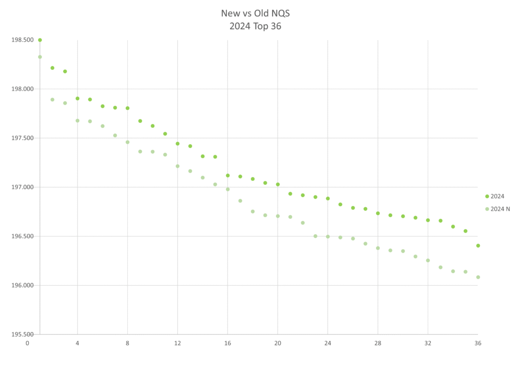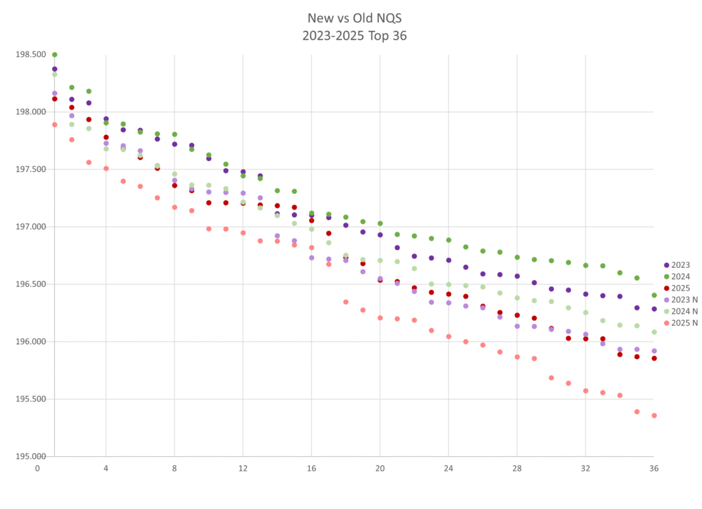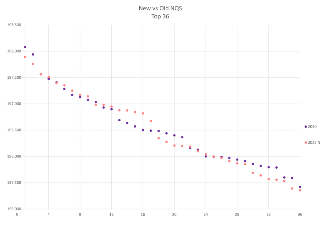 From past analyses*, we know that NQS scores have increased every year this decade until we saw a decrease in 2025, with 2025 dropping down to 2021 levels. It looks like these new NQS scores also drop us down in scores by a couple of years, with 2025’s new NQS being closest to 2020’s old NQS, new 2024 and 2022 being most similar, and new 2023 and 2021 being most similar.