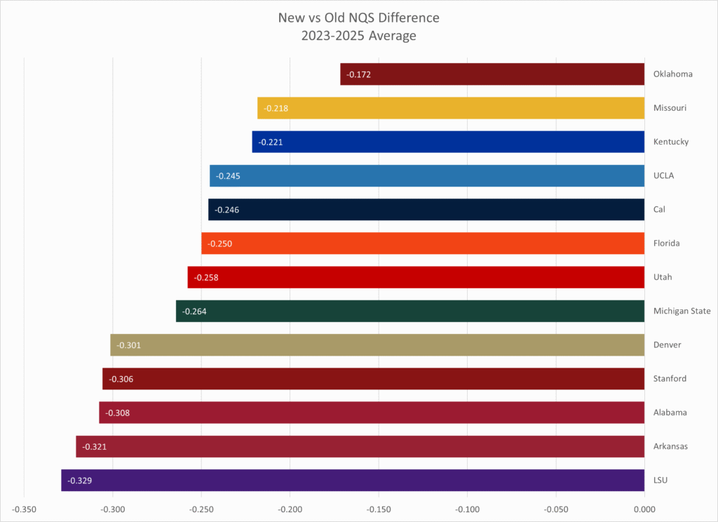 So overall, the new NQS system is another step the WCGA and NCAA have taken to reel in the ever-increasing scoring we’ve seen over the last few years. There is a decrease across the board, but we’ll still see the same general ranking of teams as before – with a few exceptions every year.